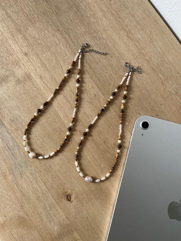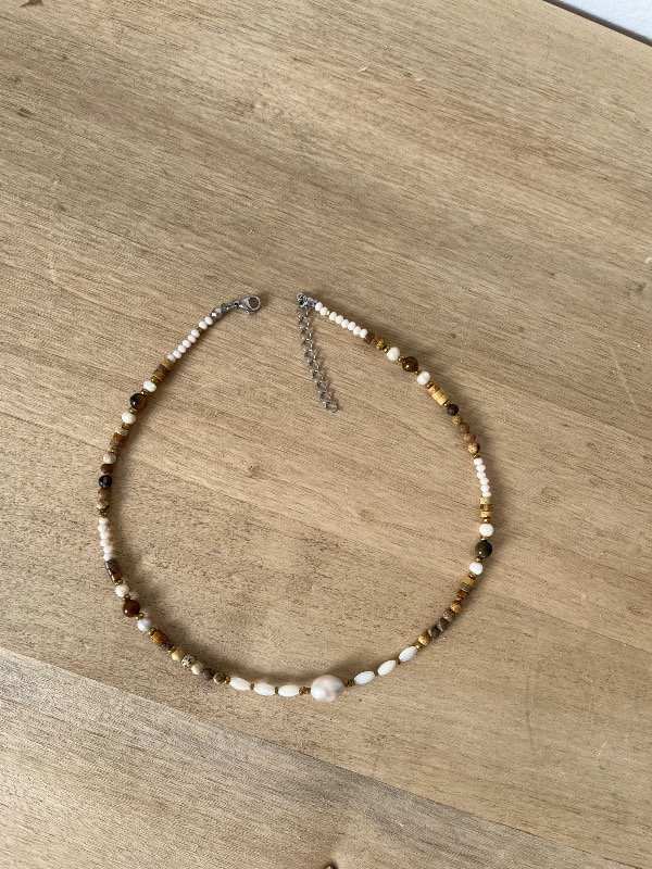 Accesorio de perlas de río y piedras naturales con terminación de acero quirúrgico -tapanudo, mosquetón y cadena de alargue-.