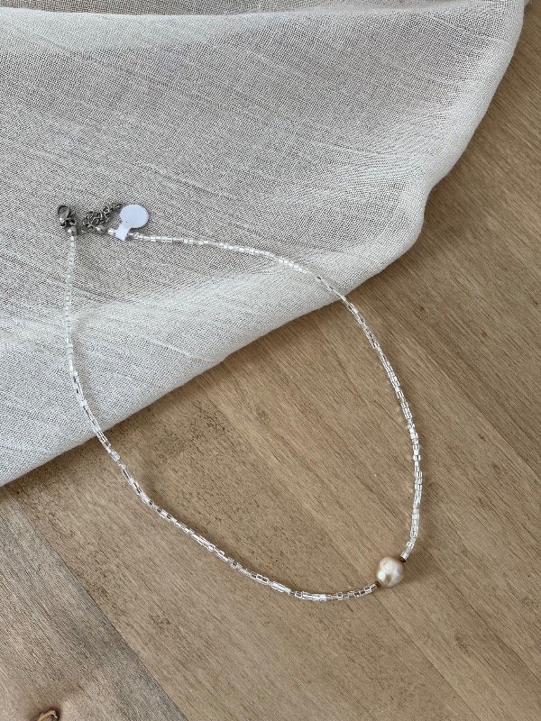 Accesorio de perla natural combinado con vidrio y hematitas doradas con terminación de acero quirúrgico -tapanudo, mosquetón y cadena de alargue-.