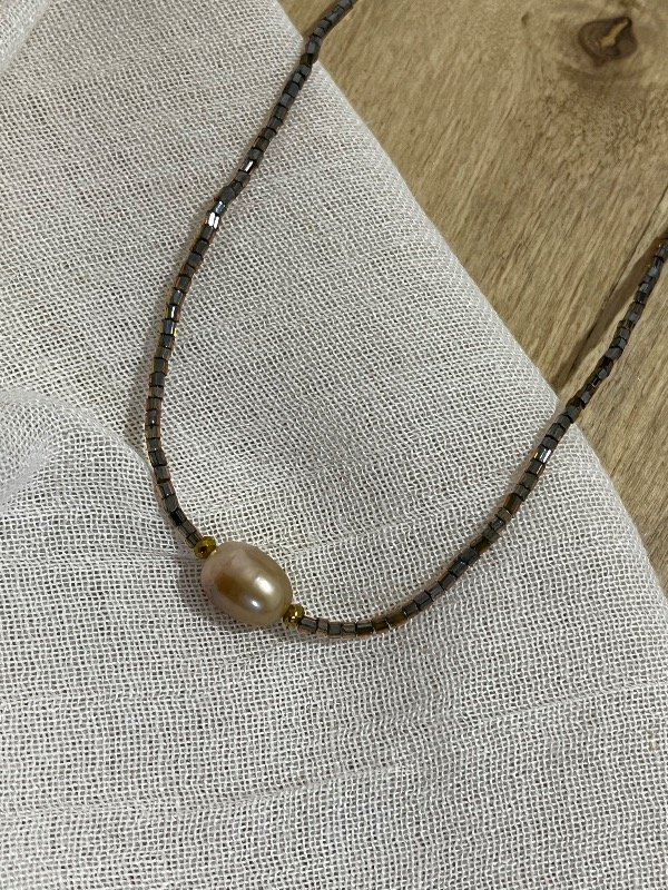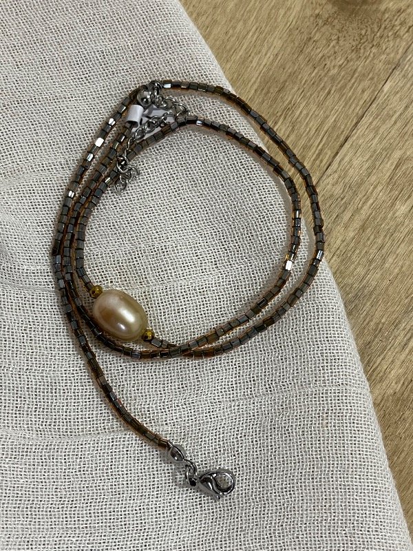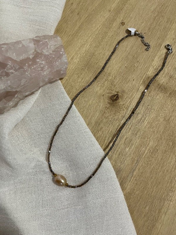 Accesorio de perla natural combinado con vidrio y hematitas doradas con terminación de acero quirúrgico -tapanudo, mosquetón y cadena de alargue-.