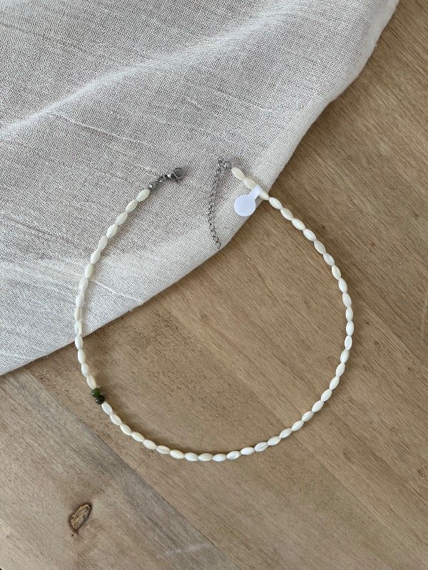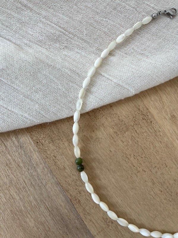 Accesorio de perla natural combinado con piedra jade con terminación de acero quirúrgico -tapanudo, mosquetón y cadena de alargue-.