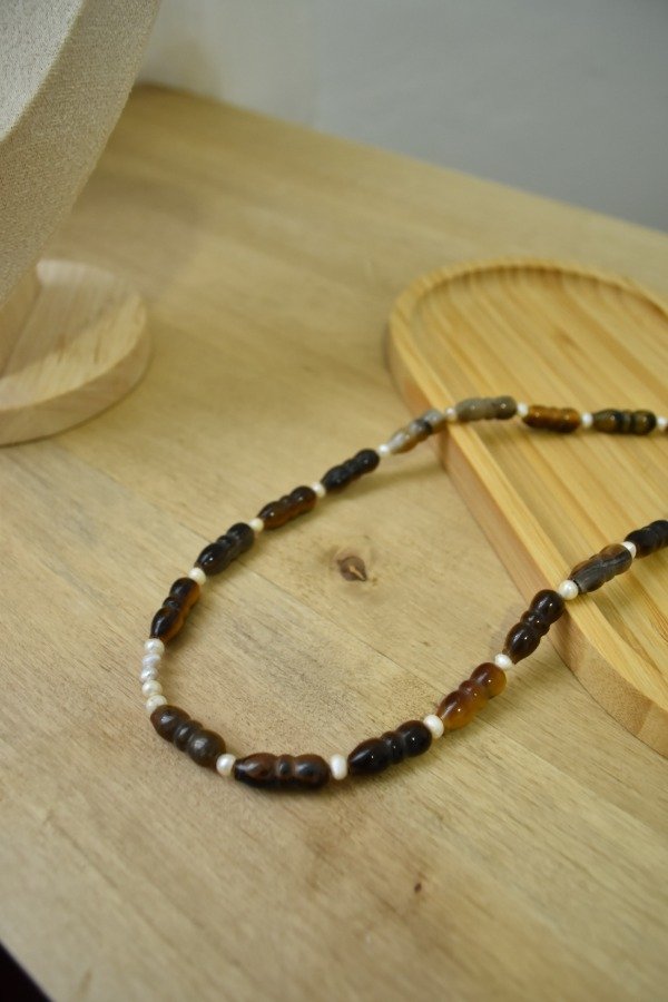 Accesorio de piedras naturales y perlas de río con terminaciones de acero quirúrgico -tapanudos, mosquetón y cadena de extensión.-