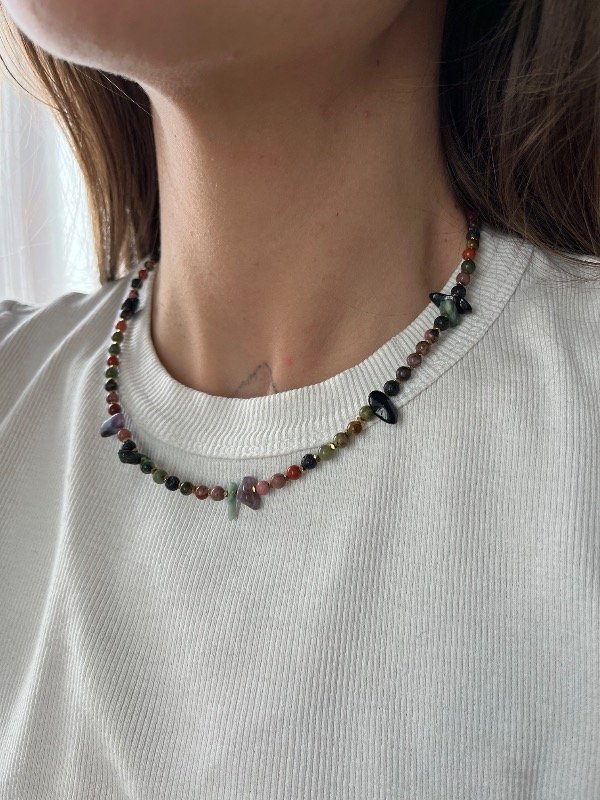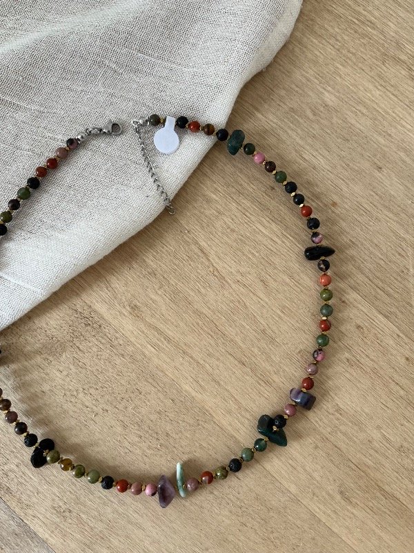 Accesorio de piedras naturales combinado con hematitas doradas con terminación de acero quirúrgico -tapanudo, mosquetón y cadena de alargue-.