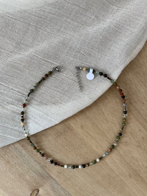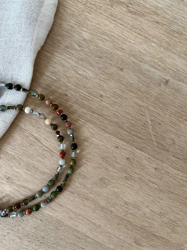 Accesorio de piedras naturales combinado con hematitas doradas con terminación de acero quirúrgico -tapanudo, mosquetón y cadena de alargue-.