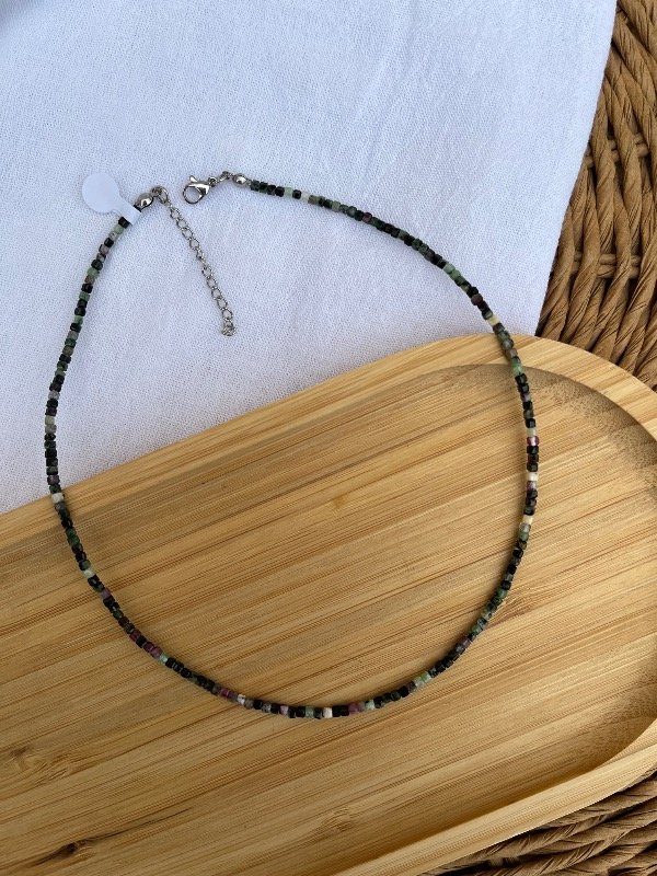 Accesorio de piedras naturales con terminación de acero quirúrgico -tapanudo, mosquetón y cadena de alargue-.