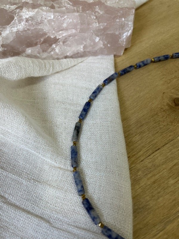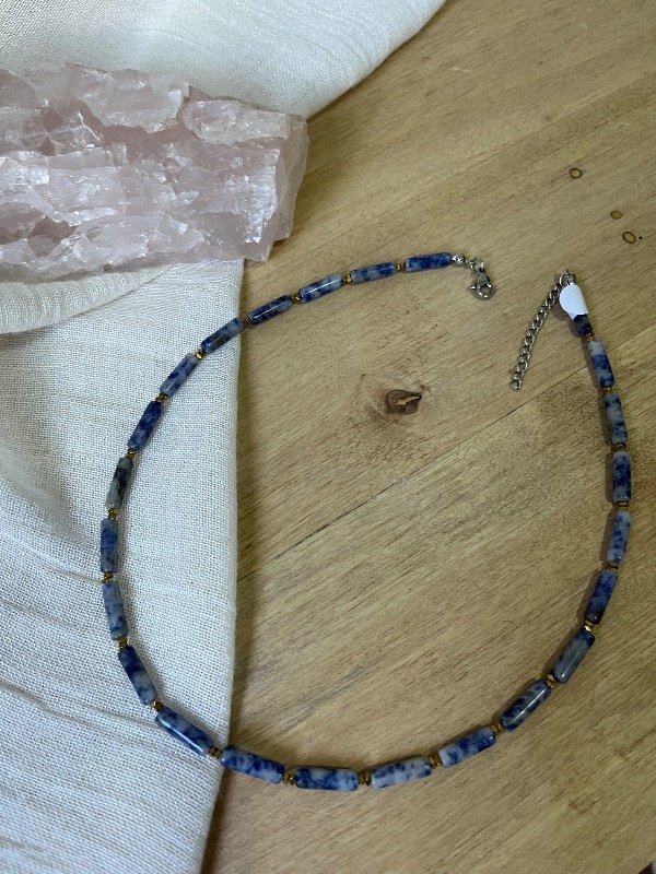 Accesorio de piedras naturales combinado con hematitas doradas con terminación de acero quirúrgico -tapanudo, mosquetón y cadena de alargue-.