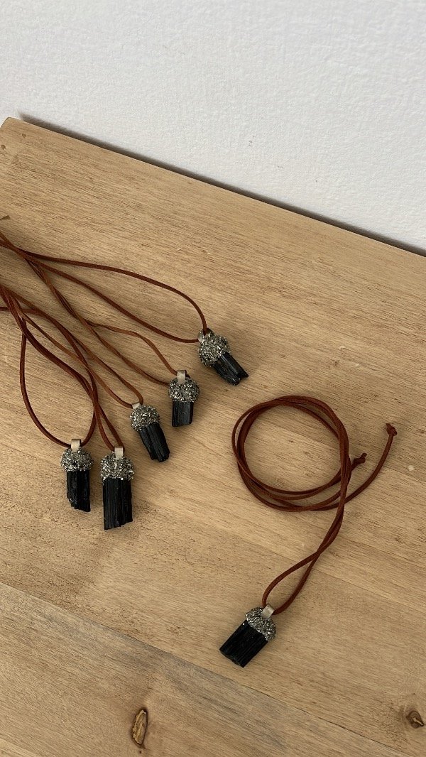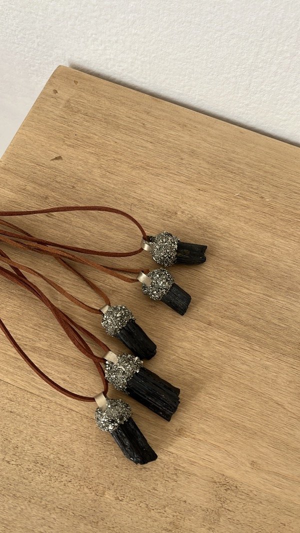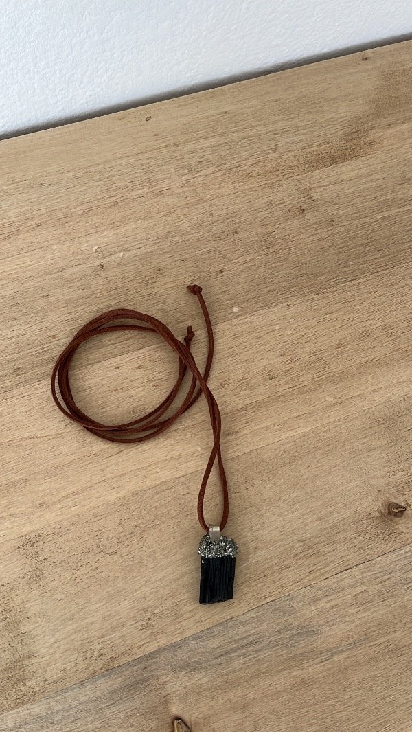 Accesorio de piedras naturales con terminación de gamuza color marrón y portadije de alpaca.